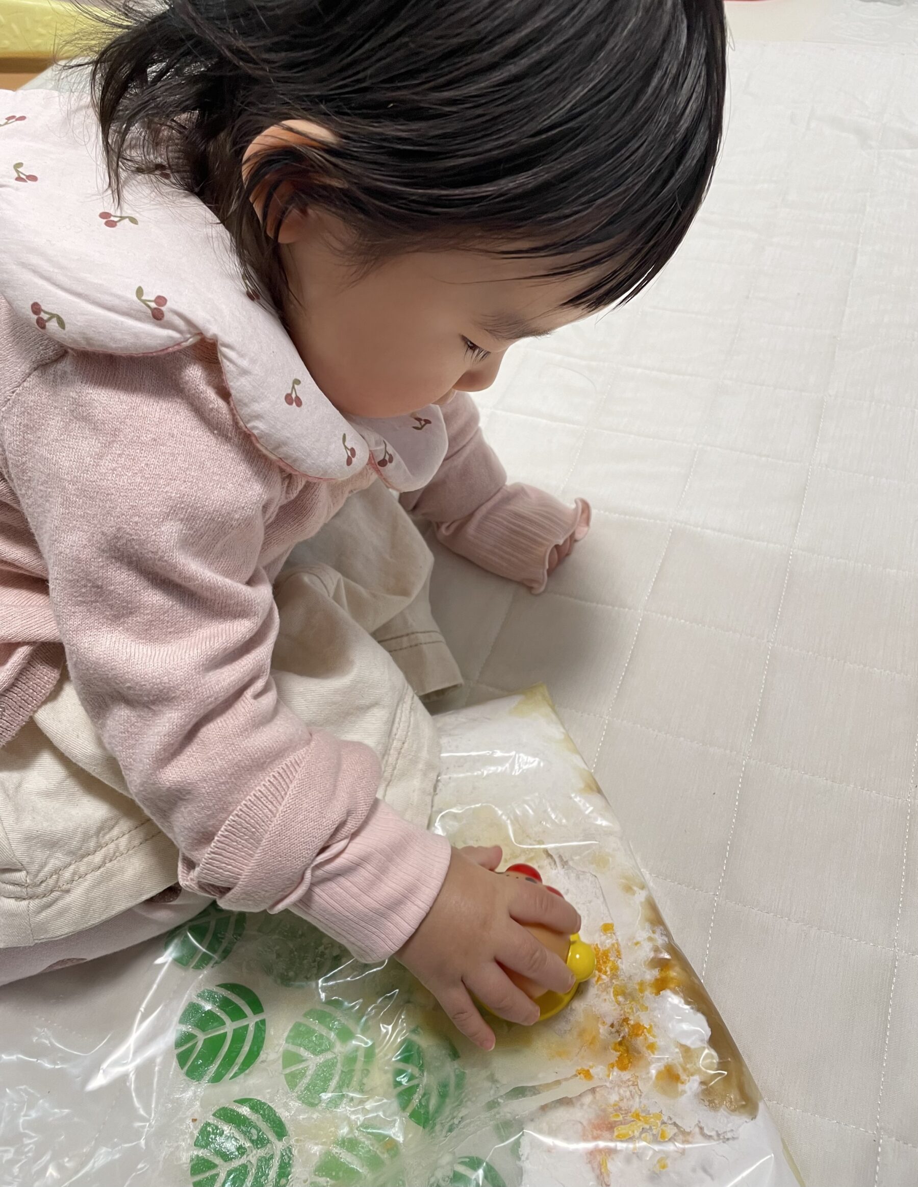 材料を袋に入れてまぜまぜ(してもらうつもりがおもちゃで叩きつけて一瞬であきてました。笑)